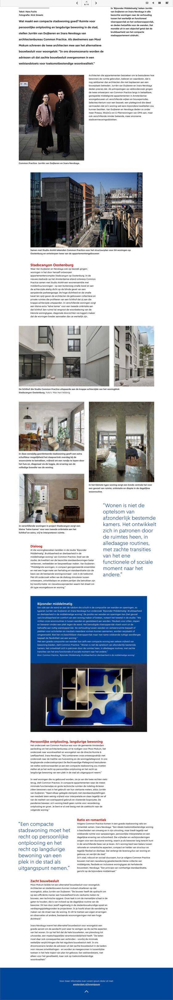 De richtlijnen van het team Kwaliteit kleine woningen landden in hoofdstuk 4 van de Handreiking Gewoon Goed. En in de bijlage Woonkwaliteit die het team opstelde voor alle partijen die betrokken zijn bij de woningbouwopgave - van Grond en Ontwikkeling tot stedenbouwers, projectontwikkelaars en architecten. Aan de hand van de richtlijnen zou je volgens Fenna Haakma Wagenaar met een aantal vanzelfsprekende stappen het gesprek over woonkwaliteit bij elke opgave kunnen voeren: “Het begint met het bepalen van het programma. Voor wie bouw je? Wat voor een buurt wil je realiseren, wat voor een omgeving? Pas daarna ontwerp je een passende maatvoering van de envelop. In die envelop laat je ruimte, zodat een architect of ontwikkelaar met een goede en passende oplossing kan komen.” Vervolgens toets je plattegrond en envelop, aldus Milena Zaklanovic: “Let bij die plattegrondtoets niet alleen op vierkante meters maar juist op de indeling. Als een woning goed ontworpen is kun je er vaak met meerdere mensen langdurig goed in wonen - bijvoorbeeld in een tweezijdig georienteerde portiekwoning van vijftig vierkante meter waarin je in het midden binnenkomt. De realiteit van de woningbouw vereist dat wij de sturing en toetsing bij deze opgave terugpakken. Met het Impulsprogramma Gewoon Goed en de bijlage Woonkwaliteit creëren we dat mandaat.”