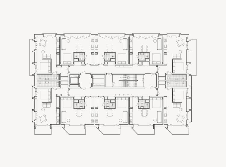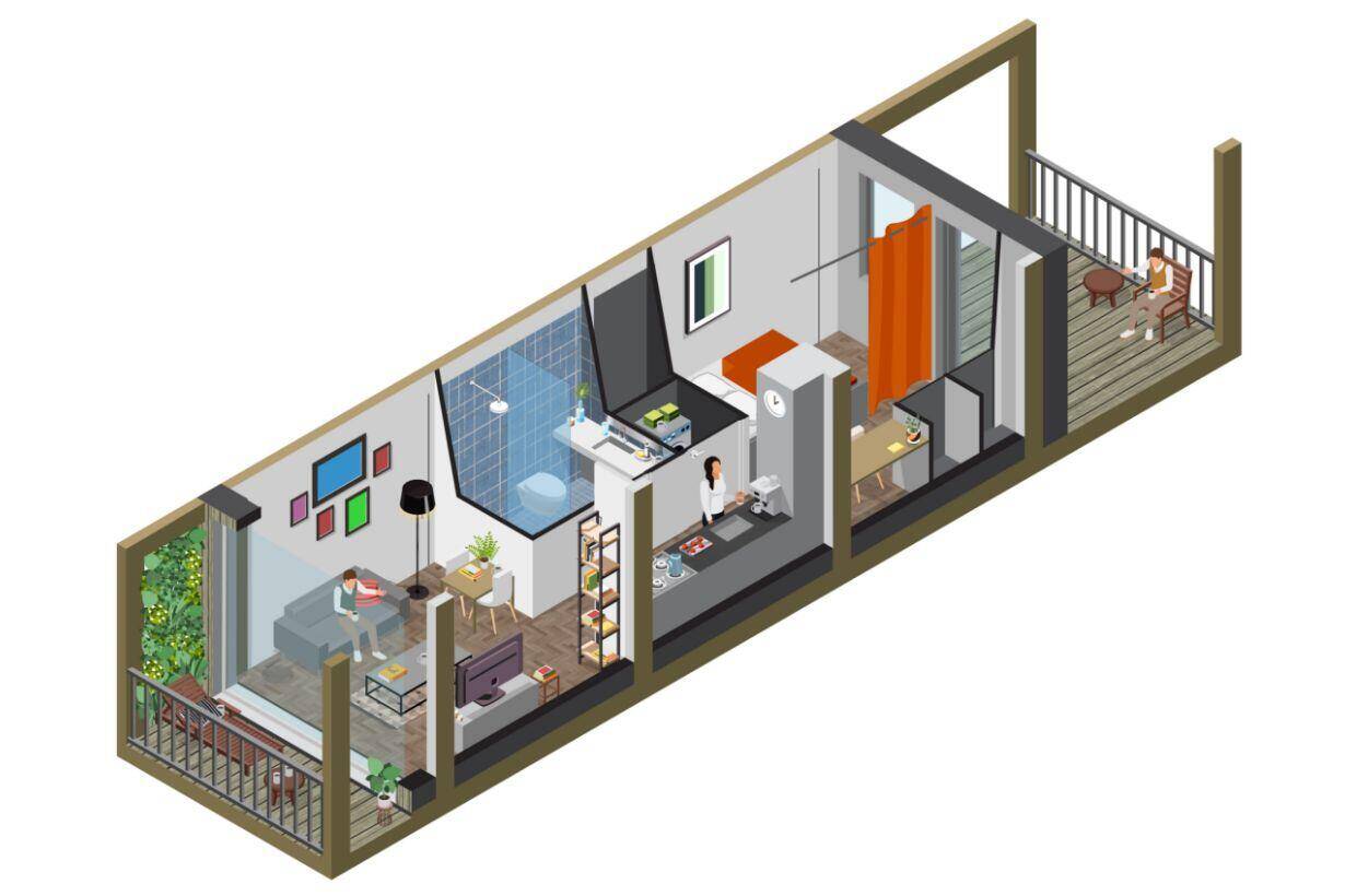 In Sluisbuurt ontwierp NAT architecten The Suites, een woongebouw met appartementen van 33 vierkante meter. De langgerekte plattegrond zorgt voor een goede functiescheiding waardoor twee mensen hier goed samen kunnen wonen.