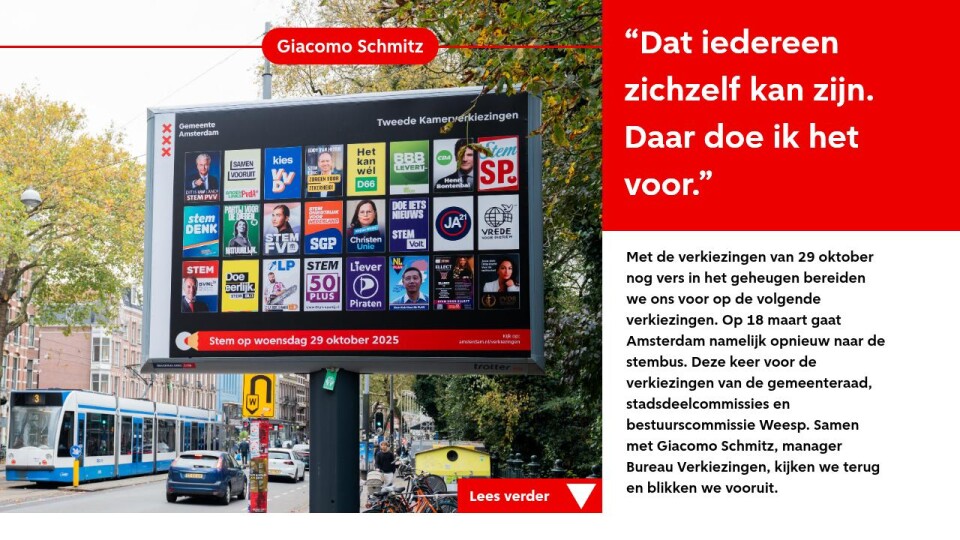 Met de verkiezingen van 29 oktober nog vers in het geheugen bereiden we ons voor op de volgende verkiezingen. Op 18 maart gaat Amsterdam namelijk opnieuw naar de stembus. Deze keer voor de verkiezingen van de gemeenteraad, stadsdeelcommissies en bestuurscommissie Weesp. Samen met Giacomo Schmitz, manager Bureau Verkiezingen, kijken we terug en blikken we vooruit.