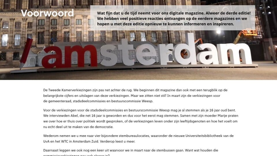 De Tweede Kamerverkiezingen zijn pas net achter de rug. We beginnen dit magazine dan ook met een terugblik op de belangrijkste cijfers en uitslagen van deze verkiezingen. Maar we zitten niet stil! In maart zijn de verkiezingen voor de gemeenteraad, stadsdeelcommissies en bestuurscommissie Weesp.